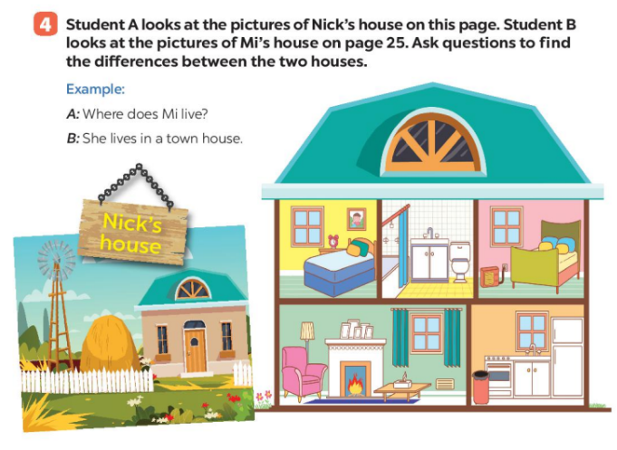 Học sinh A nhìn vào bức tranh nhà của Nick ở trong trang này. Học sinh B nhìn vào bức tranh nhà của Mi ở trang 25. Hỏi nhau câu hỏi để tìm ra sự khác nhau giữa hai ngôi nhà.