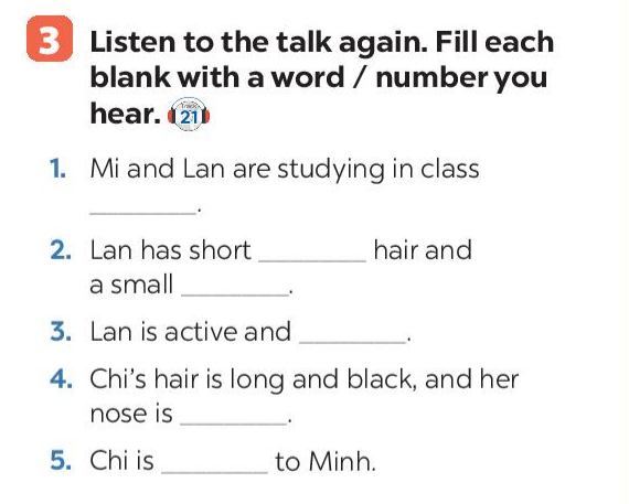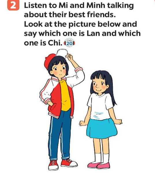 Bài 2. Listen to Mi and Minh talking about their best friends. Look at the picture below and say which one is Lan and which one is Chi.