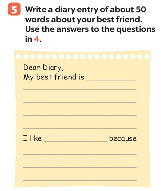Bài 5: Write a diary entry of about 50 words about your best friend. Use the answers to the questions in 4.