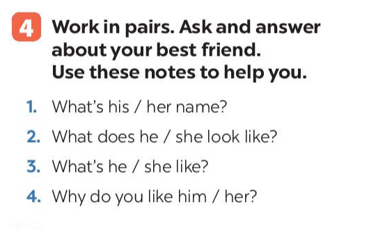 Bài 4: Work in pairs. Ask and answer about your best friend. Use these notes to help you.