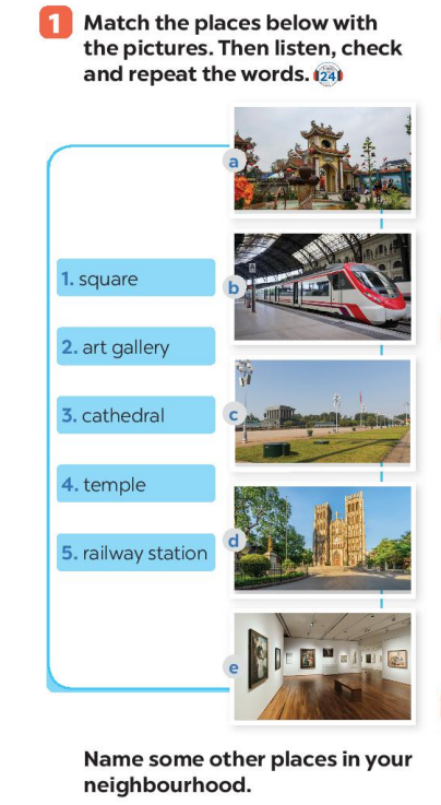 (Nối các địa điểm bên dưới với từng bức tranh. Sau đó nghe, kiểm tra và nhắc lại các từ)