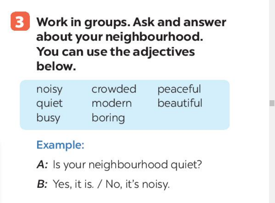 Bài 3. Work in groups. Ask and answer about your neighbourhood. You can use the adjectives below.