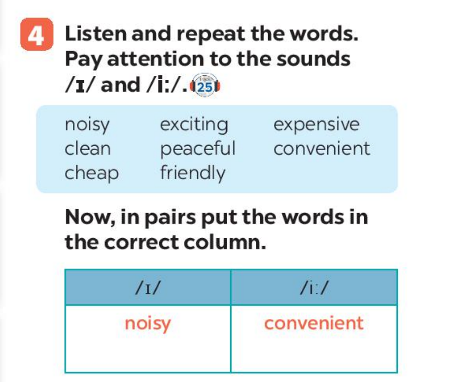 | noisy /ˈnɔɪzi/ exciting /ɪkˈsaɪtɪŋ/ expensive /ɪkˈspensɪv/ friendly /ˈfrendli/ | convenient /kənˈviːniənt/ clean /kliːn/ cheap /tʃiːp/ peaceful /ˈpiːsfl/ |