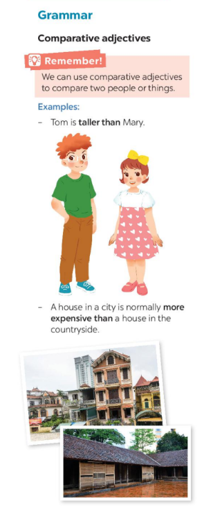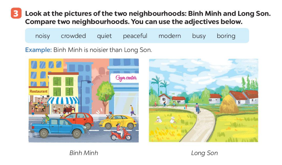 Bài 3. Look at the pictures of the two neighbourhoods: Binh Minh and Long Son. Compare two neighbourhoods. You can use the adjectives below.
