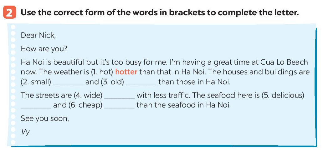 Ha Noi is beautiful but it's too busy for me. I'm having a great time at Cua Lo Beach now. The weather is (1. hot) hotter than that in Ha Noi. The houses and buildings are smaller and older than those in Ha Noi The streets are wider with less traffic. The seafood here is more delicious and cheaper than the seafood in Ha Noi.