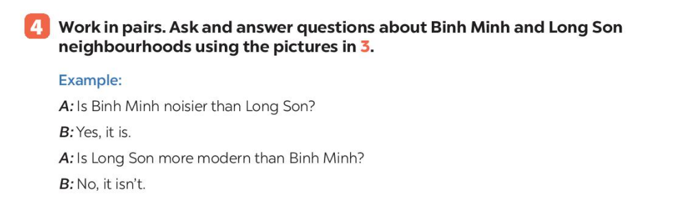 Bài 4. Work in pairs. Ask and answer questions about Binh Minh and Long Son neighborhood using the picture in 3.