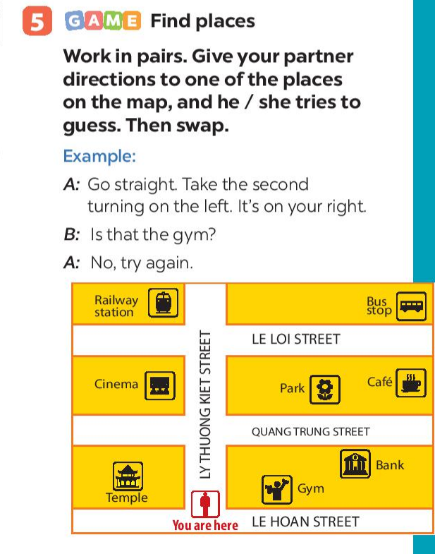 Work in pairs. Give your partner directions to one of the places on the map, and he/she tries to guess. Then swap.
