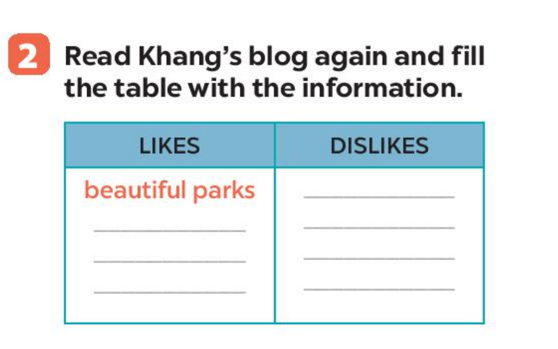 Bài 2. Read Khang’s blog again and fill the table with the information.