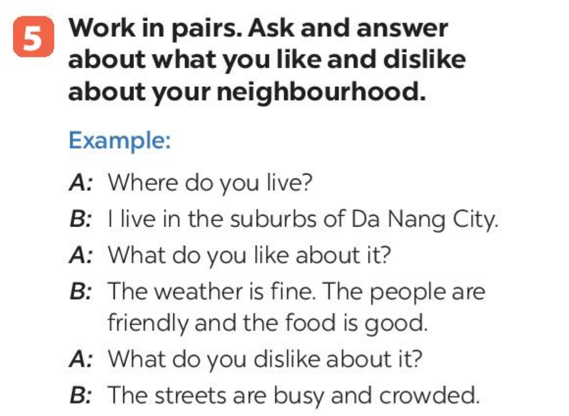 Bài 5. Work in pairs. Ask and answer about what you like and dislike about your neighbourhood.
