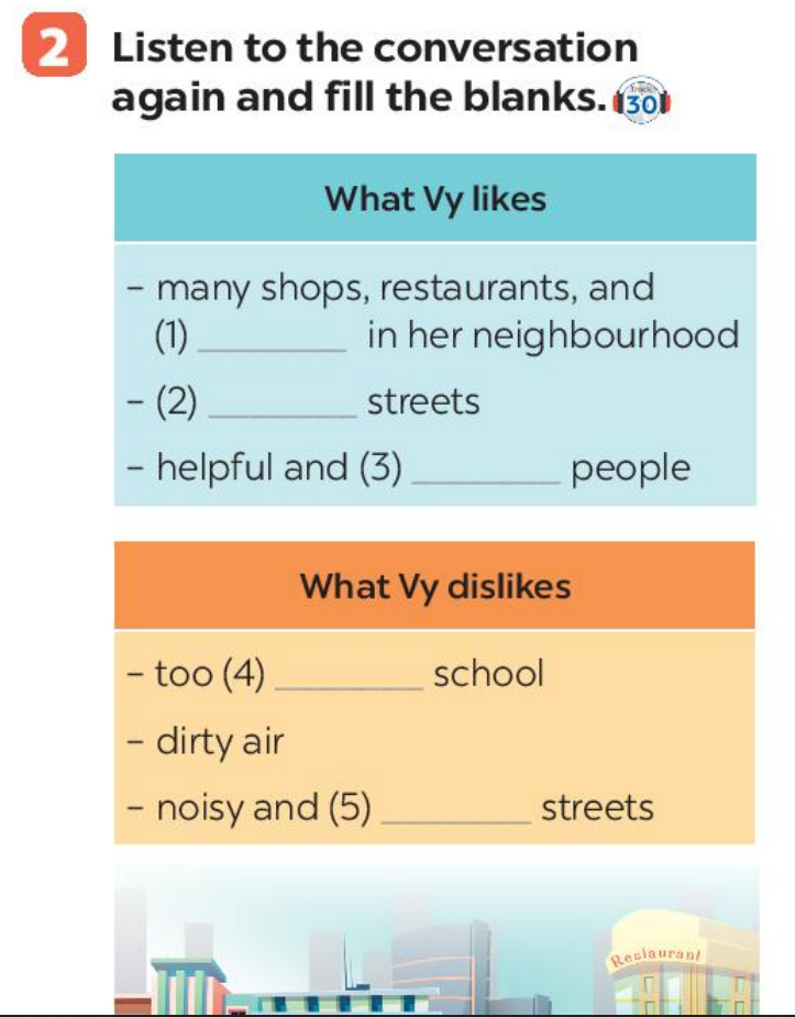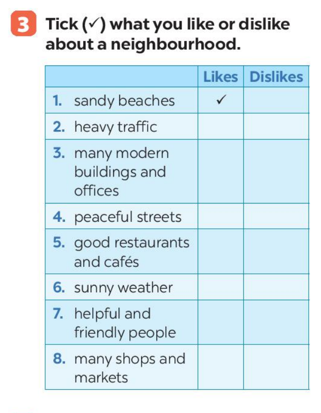 Bài 3. Tick (✔) what you like and dislike about a neighbourhood.