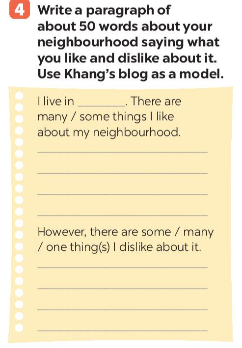 Bài 4: Write a paragraph of about your 50 words about your neighbourhood saying what you like and dislike about it. Use Khang’s blog as a model.