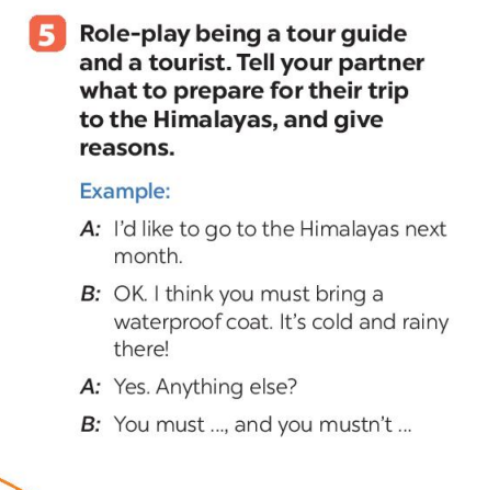 Bài 5. Role-play being a tour guide and a tourist. Tell your partner what to prepare for their trip to Himalayas, and give reasons.