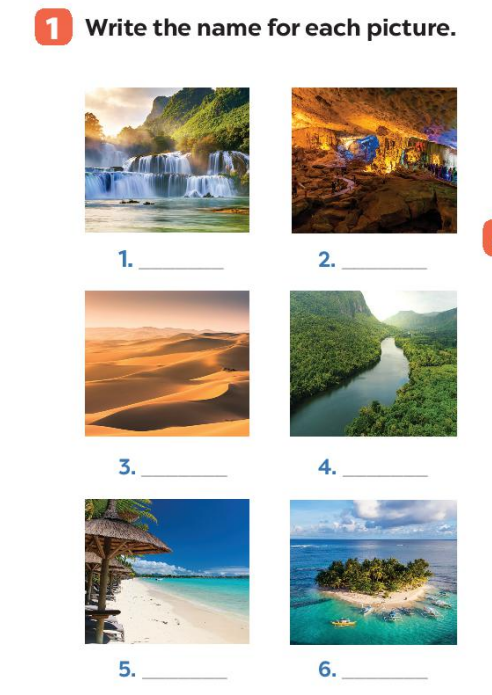 | 1. waterfall (thác nước) | 2. cave (hang động) | 3. desert (sa mạc) |