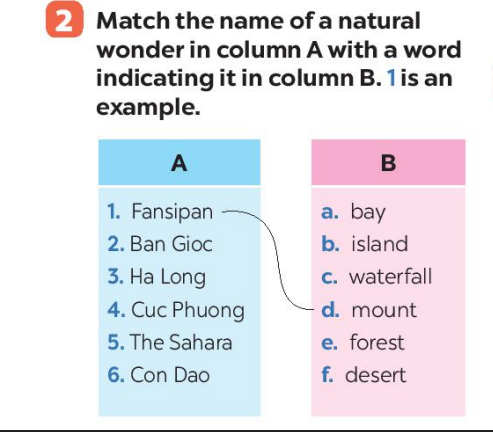 Bài 2: Match the name of a natural wonder in column A with a word indicating it in column B. 1 is an example.