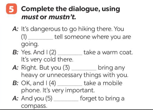 Bài 5. Complete the dialogue, using must/ mustn’t.