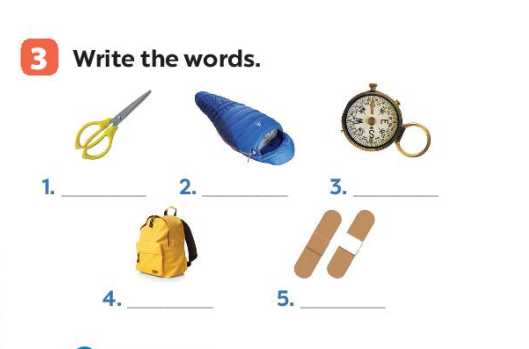 | 1. scissors | 2. sleeping bag (túi ngủ) | 3. compass | 4. backpack | 5. plaster |