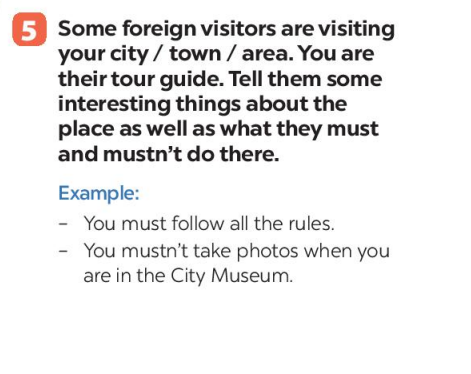 Bài 5: Some foreign visitors are visiting your city/ town/ area. You are their tour guide. Tell them what they must and mustn’t do.