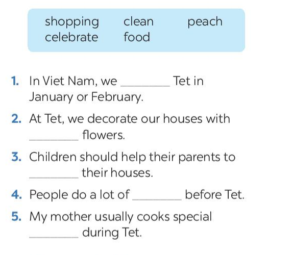 (Tết đến, chúng tôi trang trí nhà cửa với hoa đào.) - Children should help their parents to clean their houses.