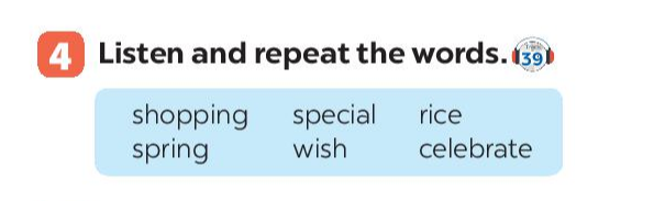 | 1. celebrate | 2. peach | 3. clean | 4. shopping | 5. food |