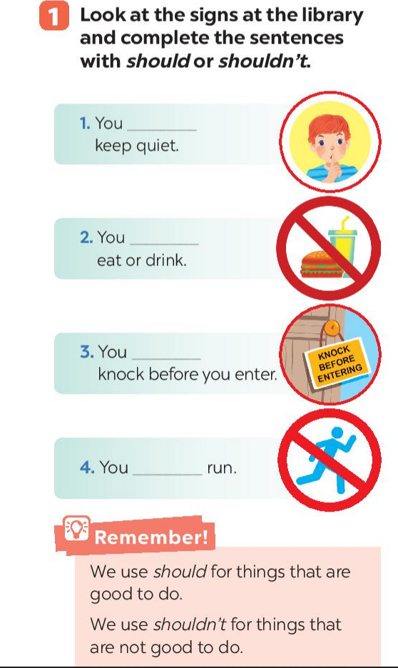 Bài 1. Look at the signs at the library and complete the sentences with should or shouldn’t.