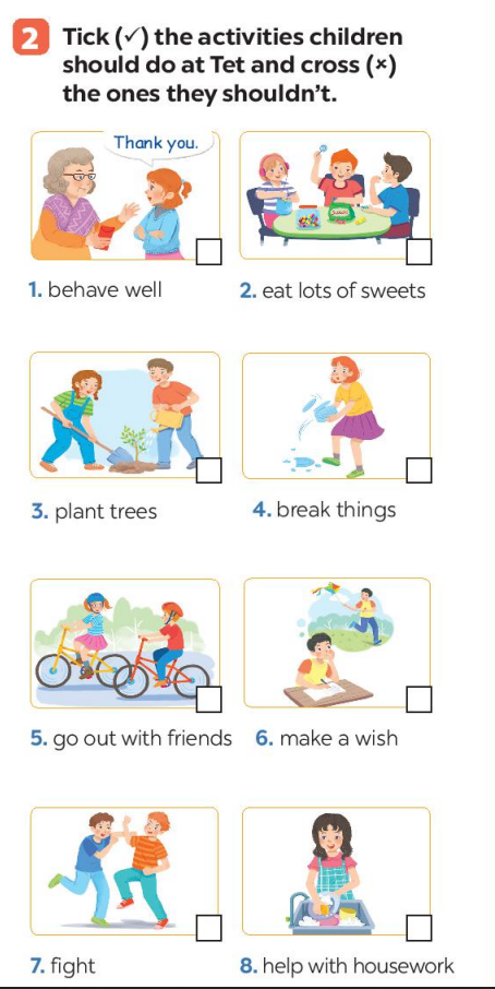 Bài 2. Tick (✓) the activities children should do at Tet and cross (x) the one they shouldn’t.