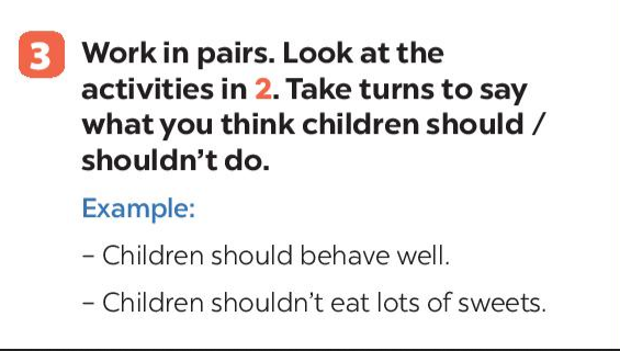 Bài 3. Work in pairs. Look at the activities in 2. Take turns to say what you think children should/shouldn’t do.