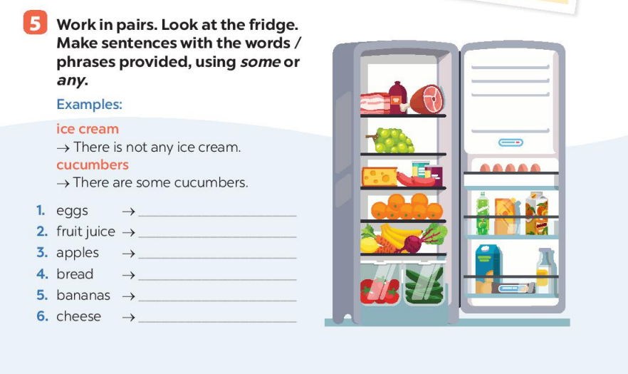 Bài 5. Work in pairs. Look at the fridge. Make sentences with the words/ phrases provided, using some or any.