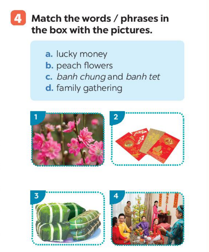 Bài 4. Match the words/ phrases in the box with the pictures.