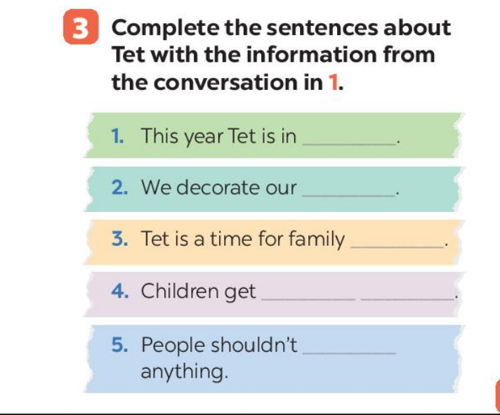 (Hoàn thành các câu về Tết với thông tin từ bài hội thoại ở hoạt động 1)