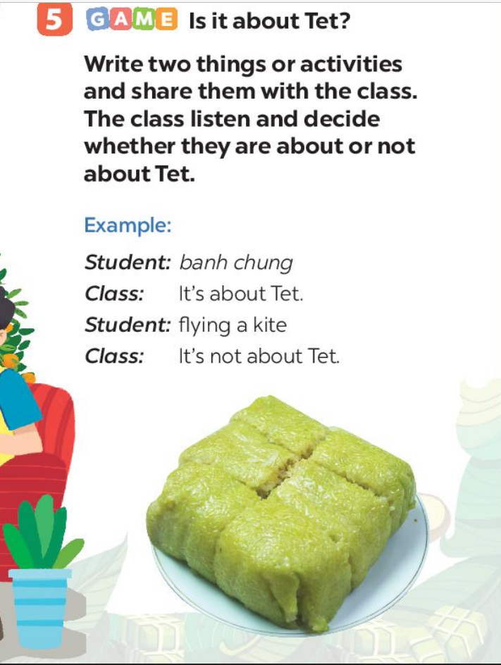 (Trò chơi: Có phải Tết không? Viết hai thứ hoặc hai hoạt động và chia sẻ điều đó với cả lớp. Cả lớp nghe và quyết định xem chúng có phải là về Tết hay không)