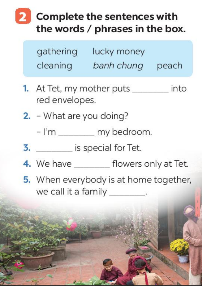 | 1. lucky money | 2. cleaning | 3. Banh chung | 4. peach | 5. gathering |