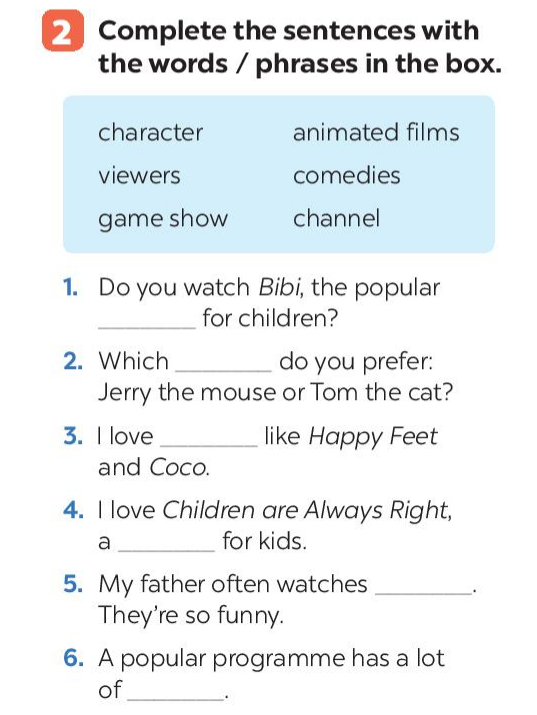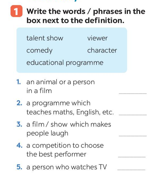 | 1. character | 2. educational progamme | 3. comedy | 4. talent show | 5. viewer |
