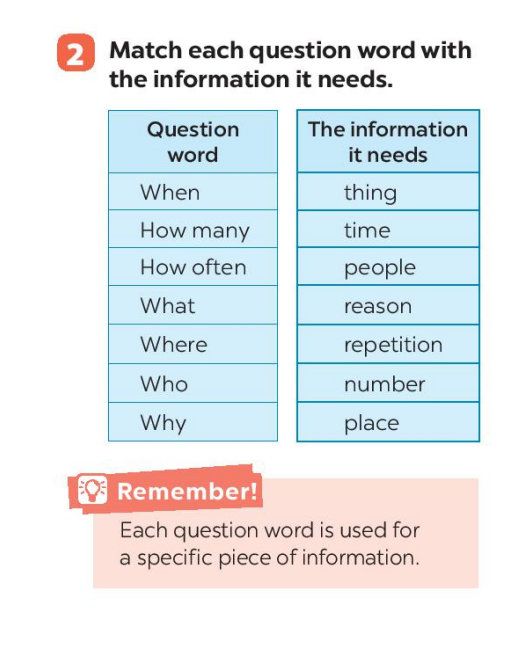(Nối các từ để hỏi với thông tin mà nó cần)