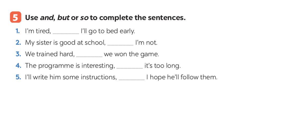(Sử dụng and, but hoặc so để hoàn thành các câu)