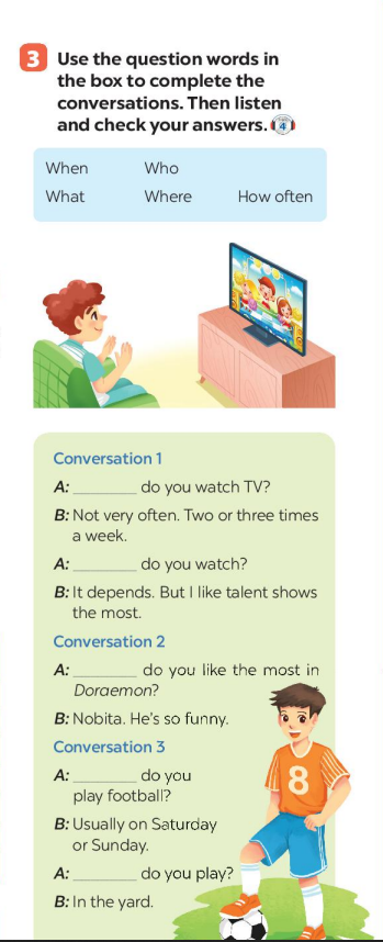Bài 3. Use the question words in the box to complete the conversations. Then listen and check your answer.