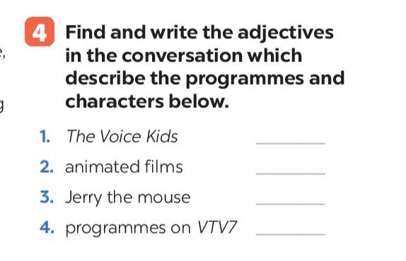 (Tìm và viết các tính từ trong bài hội thoại miêu tả các chương trình và các nhân vật bên dưới)