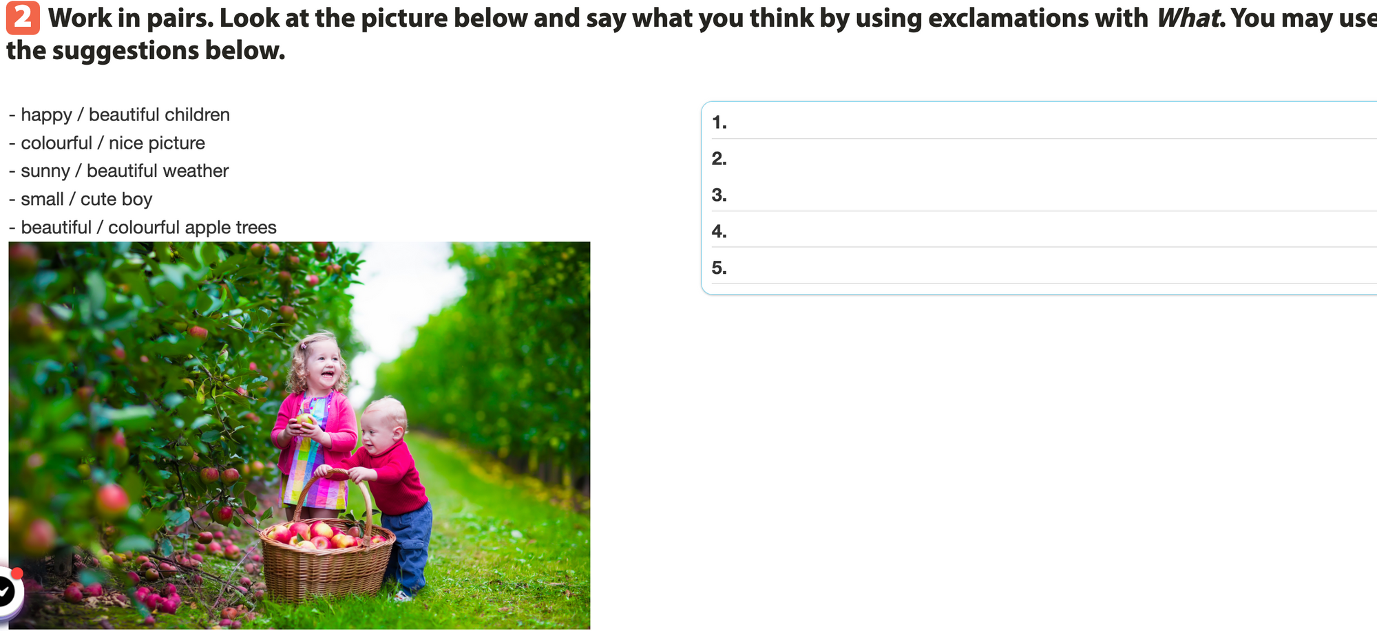 Bài 2. Work in pairs. Look at the picture below and say what you think by using exclamations with What. You may use the suggestions below.