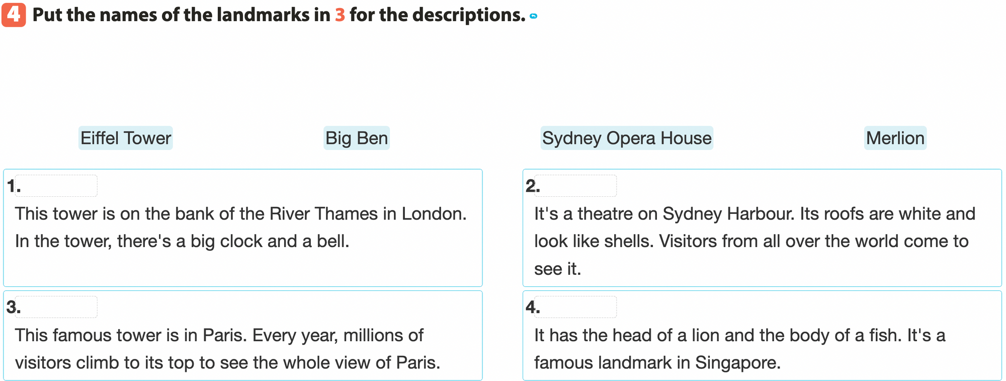 Bài 4. Write the names of the landmarks in 3 for the descriptions.