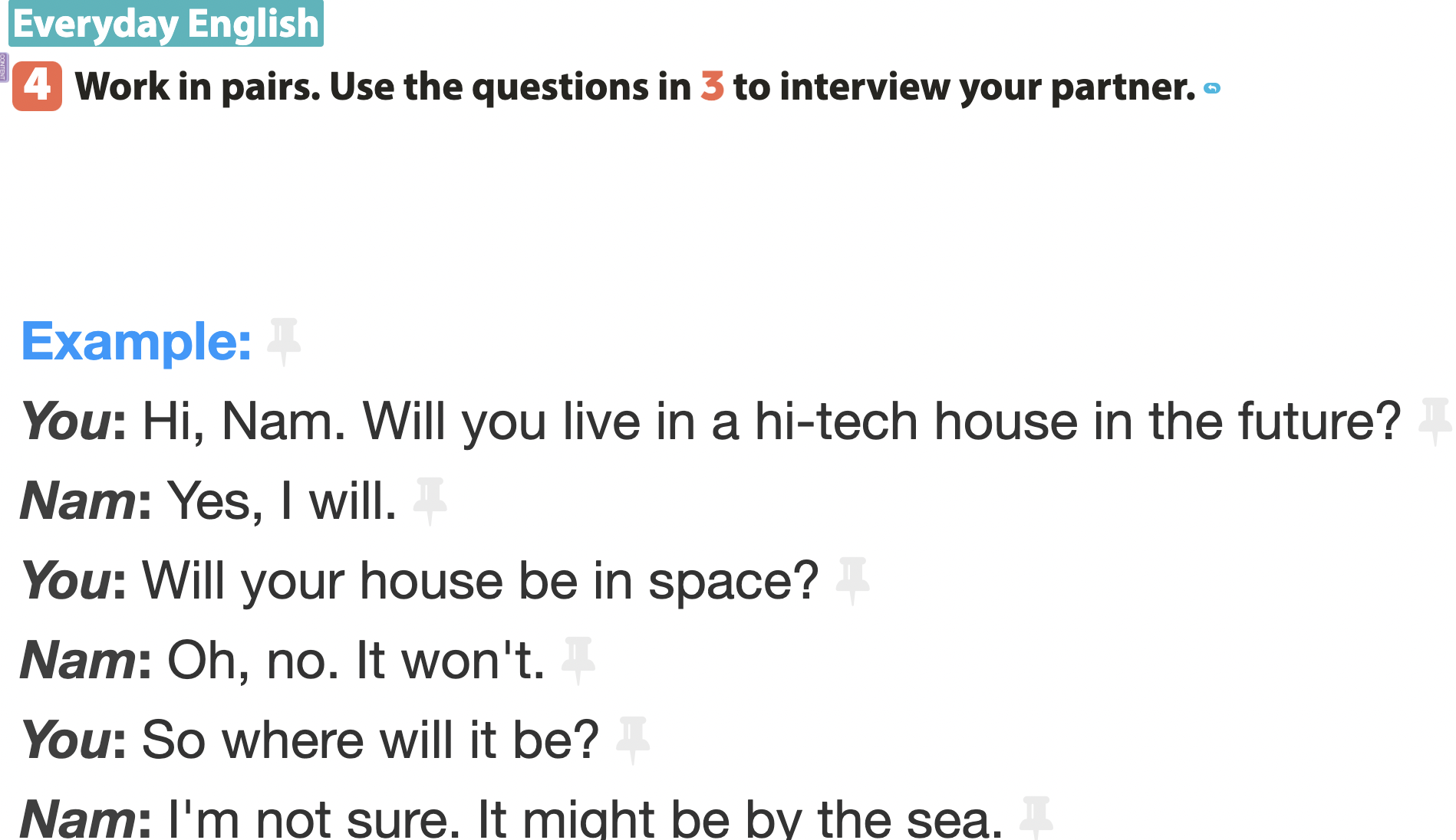 | 1. Will you live in a hi-tech house? (Bạn sẽ sống trong một ngôi nhà công nghệ cao?) 2. Will your house be in space? (Ngôi nhà của bạn sẽ ở trong không gian?) 3. Will you have a lot of trees and flowers around your house? (Bạn sẽ có nhiều cây và hoa xung quanh nhà của bạn?) 4. Will you have a fridge that can cook your meals? (Bạn sẽ có một tủ lạnh có thể nấu các bữa ăn của bạn?) 5. Will you have a robot that can look after your children? (Bạn sẽ có một người máy để chăm sóc con của bạn?) 6. Will you have a car that can fly? (Bạn sẽ có một chiếc ô tô có thể bay?) |
