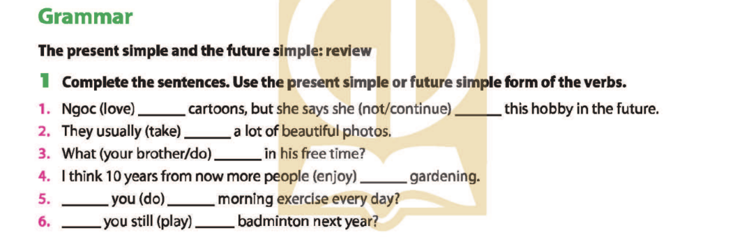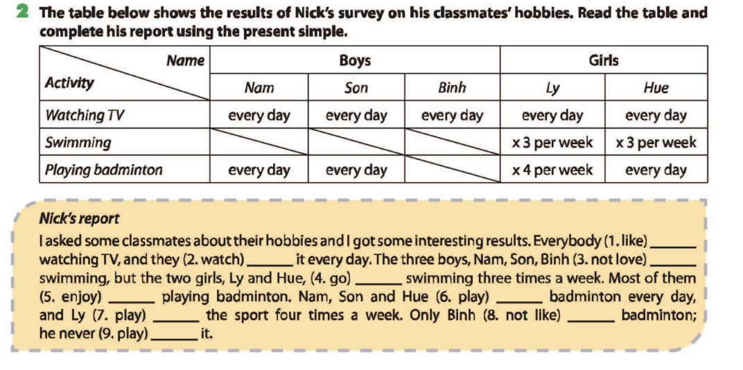 I asked some classmates about their hobbies and I got some interesting results. Everybody 1. likes watching TV, and they 2. watch it every day. The three boys, Nam, Son, Binh 3. don’t love swimming, but the two girls, Ly and Hue, 4. go swimming three times a week. Most of them 5. enjoy playing badminton. Nam, Son and Hue 6. play badminton every day, and Ly 7. plays the sport four times a week. Only Binh 8. doesn’t like badminton; he never 9. plays it.