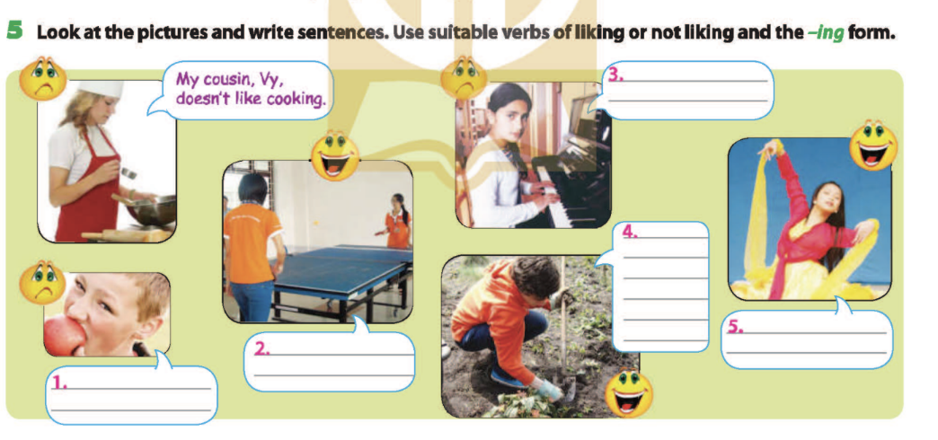 Bài 5. Look at the pictures and write sentences. Use suitable verbs of liking or not liking and the -ing form.