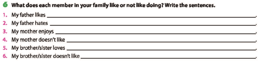 Bài 6. What does each member in your family like or not like doing? Write the sentences.