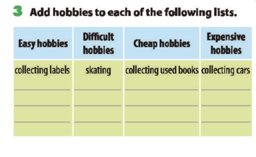 | Easy hobbies | Difficult hobbies | Cheap hobbies | Expensive hobbies (Sở thích đắt đỏ) |