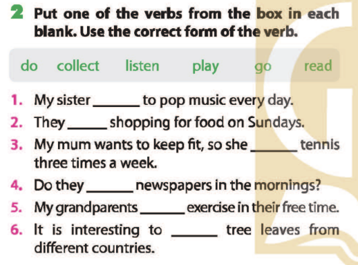 | 1. have | 2. likes | 3. plays | 4. doesn’t like | 5. enjoys |