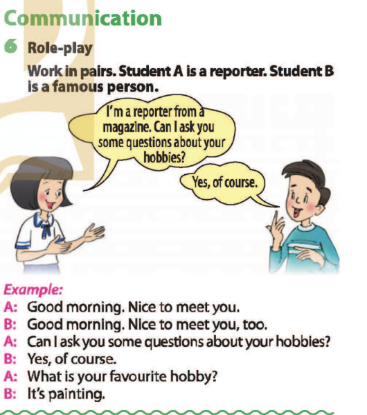 (Đóng vai. Làm việc theo cặp. Học sinh A là một nhà báo. Học sinh B là một người nổi tiếng)