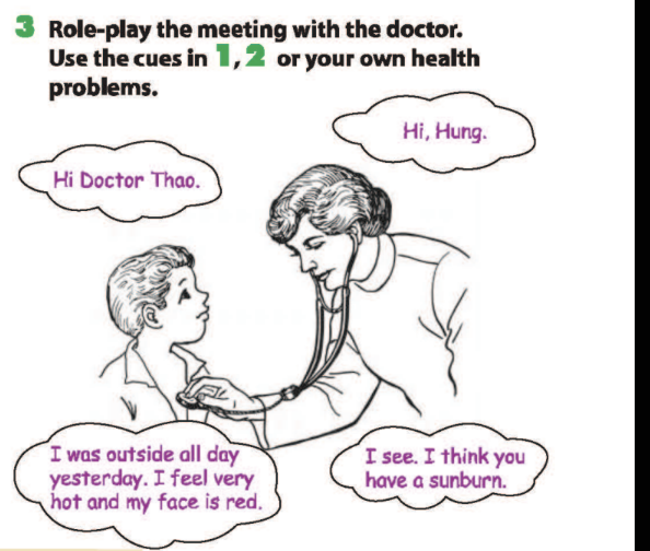 Bài 3. Role-play the meeting with the doctor. Use the cues in 1,2 or your own health problems.