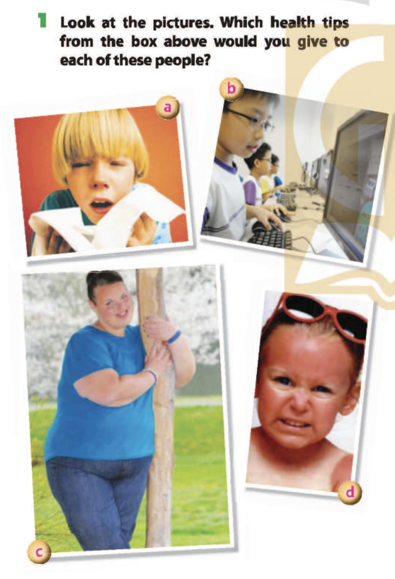 Bài 1. Look at the pictures. Which health tips from the box above would you give to each of these people?