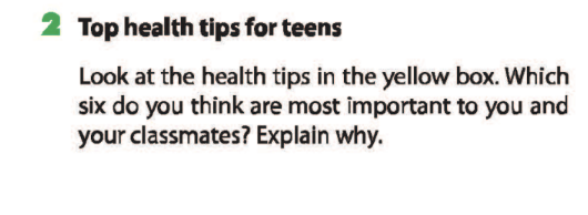 Bài 2. Top health tips for teens. Look at the health tips in the yellow box. Which six do you think are most important to you and your classmates? Explain why.