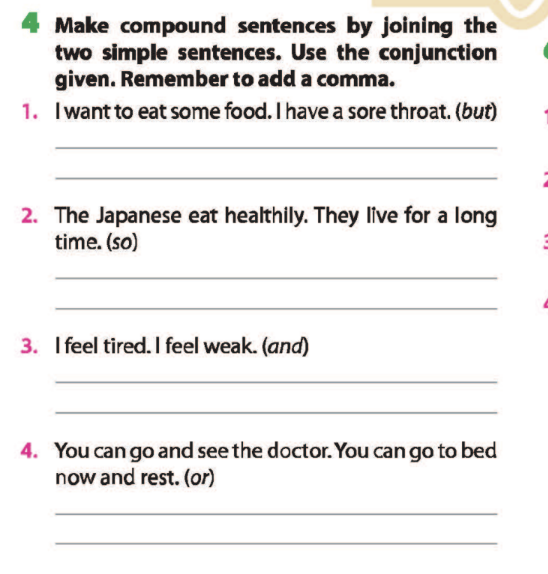 Bài 4. Make compound sentences by joining the two simple sentences. Use the conjunction given. Remember to add a comma.