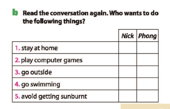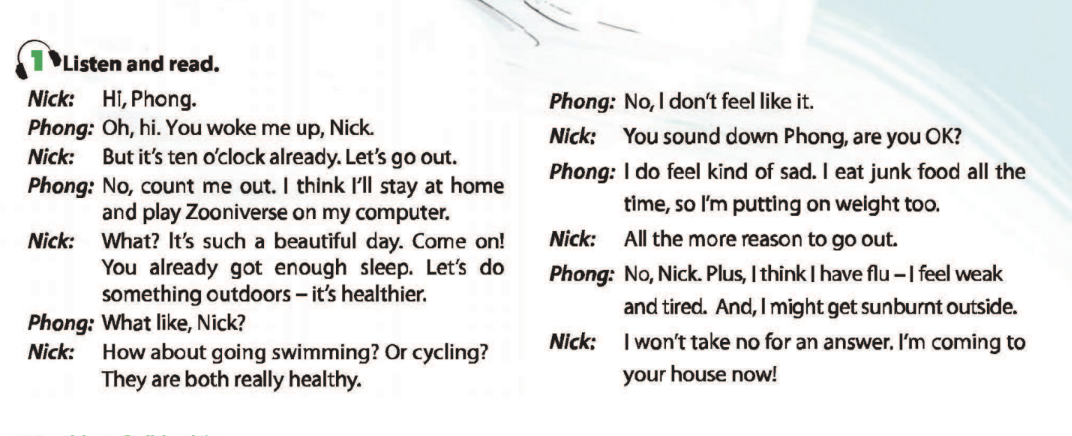 Phong: Không, Nick. Hơn nữa, mình nghĩ mình bị cảm - mình cảm thấy yếu ớt và mệt mỏi. Và, mình có thể bị cháy nắng bên ngoài.